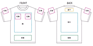 プリント位置は、襟・脇などの縫い目から1.5㎝〜2㎝内側までが印刷可能範囲です。